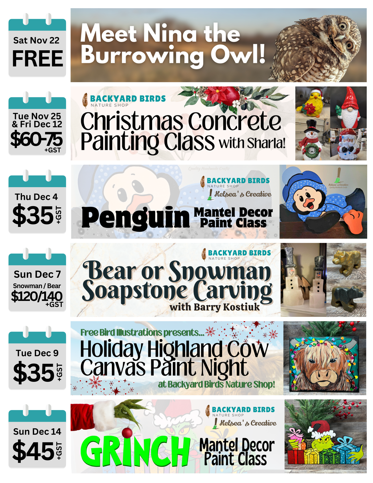 Come and join us for a fine art class here at Backyard Birds! Carve your very own Bear or Snowman statue out of soapstone with the guidance and direction of talented soapstone artist, Barry Kostiuk. This class is limited to 8 participants only, to give you as much individualized attention during the class as possible, and allow you to hone your craft throughout the day.